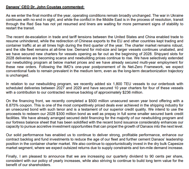 The ship chartering markets have continued with very strong demand, clearly exceeding supply. This means that companies chartering out vessels are enjoying very good and long-lasting returns. For example, GSL 2025 is fully sold out, 96% of 2026 capacity is sold, and 76% of 2027 capacity is already sold at very comfortable levels, meaning companies will continue their good performance for at least the next couple of years. At some point, the fleet should also start to renew, which could also provide support for companies chartering out vessels.