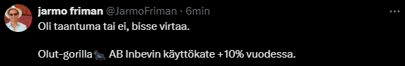 Twitterissa Friman huomioinut miten Inbev porskuttaa menemään. 13. päivä sitten nähdään Olvin osalta onko lämmin kesä puskenut myyntiä nextille levelille.
