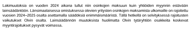 " Lakimuutoksia on vuoden 2024 aikana tullut niin osinkojen maksuun kuin yhtiöiden myynnin estävään lainsäädäntöön. Länsimaalaisessa omistuksessa olevien yritysten osinkojen maksamista ulkomaille on rajoitettu vuosien 2024-2025 osalta asettamalla säädöksiä enimmäismääristä. Tämänhetkisen tulkinnan mukaan osinko, jonka Valko-Venäjän yhtiö voi lain mukaan emoyhtiölle maksaa on noin 1-3 miljoonaa euroa vuosittain vuosina 2024-2025. Myyntikieltoa koskevista lainsäädännön muutoksista huolimatta Olvin tytäryhtiön osakkeita koskevat myyntirajoitukset ovat voimassa**.** Olvilla ei ole lupaa Valko-Venäjän tytäryhtiön osakkeiden myyntiin. Seuraamme aktiivisesti lainsäädäntötilannetta."