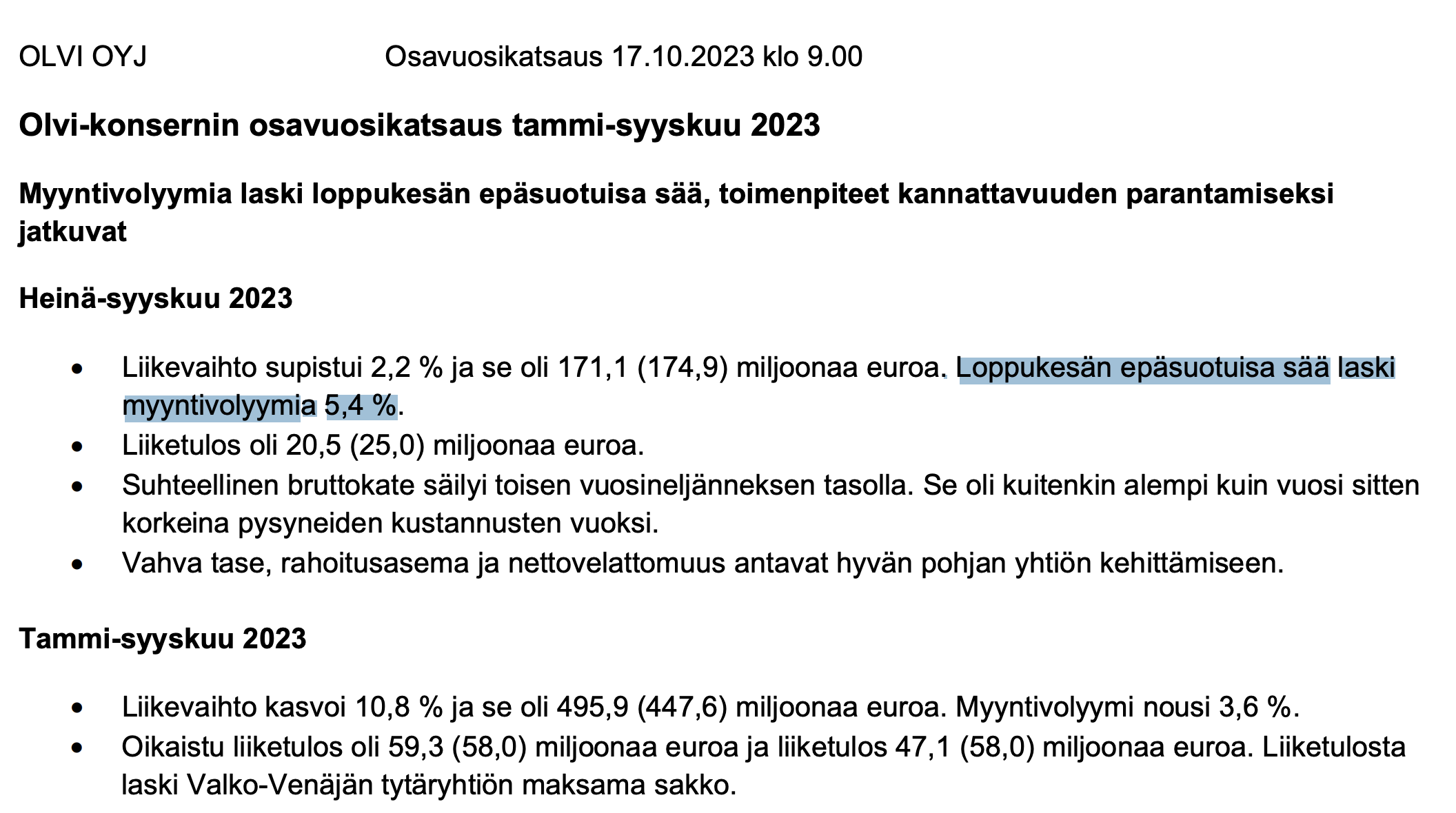 Olvilta positiivinen tulosvaroitus: vuoden 2024 oikaistu liiketulos nousee 78-84 milj. euroon (aik. ohjeistus 74-80 milj. euroa)