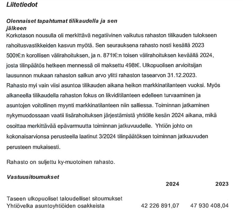 - Tilikauden jälkeen yhtiö on vastaanottanut vaatimuskirjeen hoivakiinteistöön liittyen (vesivahinko, vaatimuksen suuruus ~3 M€)