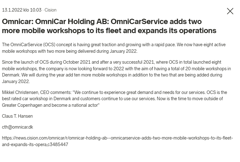 "OmniCar Holding AB: 2021 revenue guidance beat by 10%