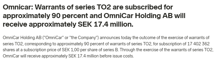 Jos ymmärsin oikein, niin tässä on T02 Warrantteihin liittyvä täydennysanti joka oli ilmoitettu ja jolla annetaan tuolle pienelle ryhmälle mahdollisuus ostaa lisää 1 SEK osakkeita, eli tässä ei mitään uutta.