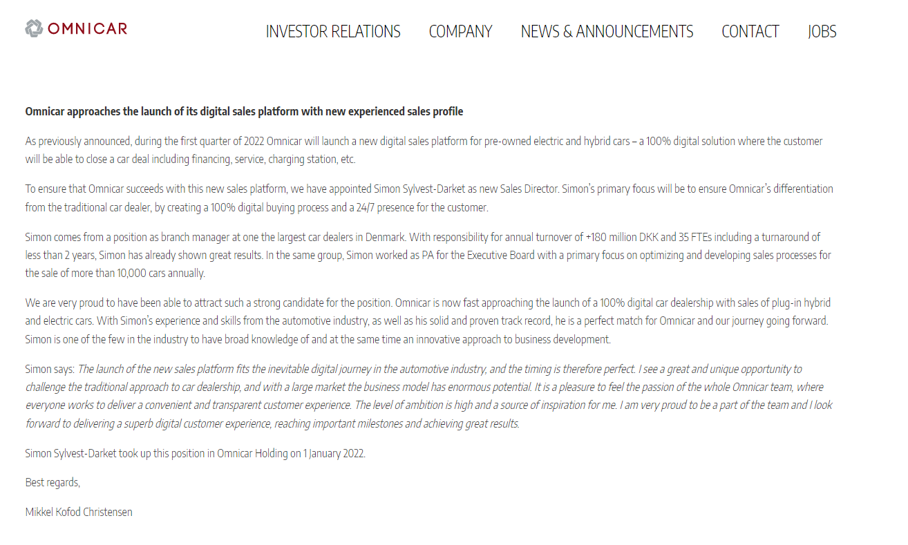 We will during the first quarter of 2022 enter the field of car sales as previously announced "