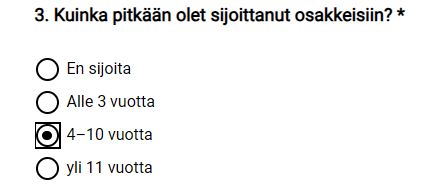 Teen opinnäytetyötä Hämeen ammattikorkeakoulussa aiheesta: Small Cap -sijoittaminen osana piensijoittajan sijoitusstrategiaa. (Kyselyyn saa ja siihen toivotaan vastauksia myös henkilöiltä, jotka eivät sijoita Small Cap -yhtiöihin.) Vastaamisessa menee noin 3–5 minuuttia ja vastaajalta kysytään korkeintaan 18 kysymystä. Kysymysten määrään vaikuttaa vastaajan antamat vastaukset.