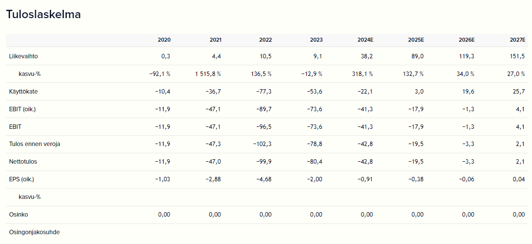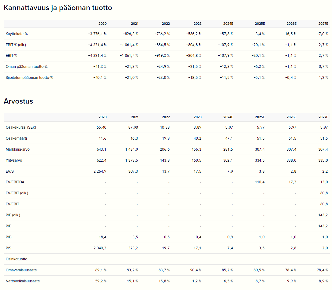 Yhtiön liikevaihto kasvoi 117 % toisella vuosineljänneksellä, mutta jäi kuitenkin ennusteista. Korkeiden kiinteiden kulujen vuoksi liiketulos pysyi negatiivisena, ja kassavarat olivat kauden lopussa noin 4,0 MSEK. Yhtiö sai kuitenkin myöhemmin 10,3 MSEK lainan, mutta nykyisellä kulutustasolla yhtiö saattaa tarvita lisärahoitusta vuoden lopussa tai heti alkuvuodesta 2025, vaikka parempi kassavirta FPS-tilauksista auttaisi tätä. Lyhyen aikavälin näkymiä on laskettu, mutta pitkän aikavälin kasvuodotukset ovat joka tapauksessa ennallaan. Inderesin arvion mukaan osakkeen arvo on 3,7–6,8 SEK ( osake tällä hetkellä: 6,03SEK 29.8.2024 klo 19.00) ja riskit huomioon ottaen, niin ei sillä tavalla houkuttelevalta tällä hetkellä vaikuta.