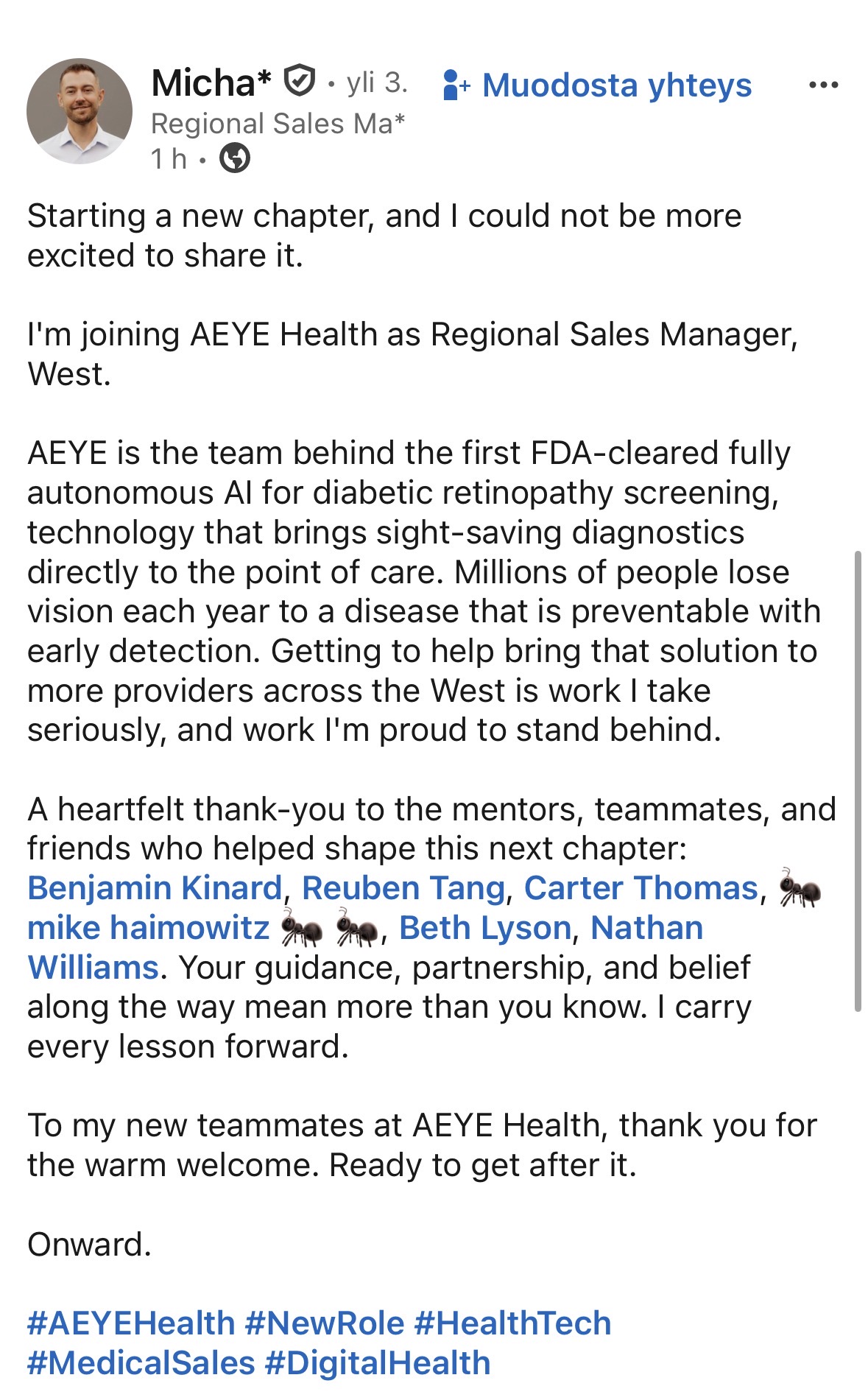 Something is apparently happening in America, as AEYE Health is hiring more sales force: