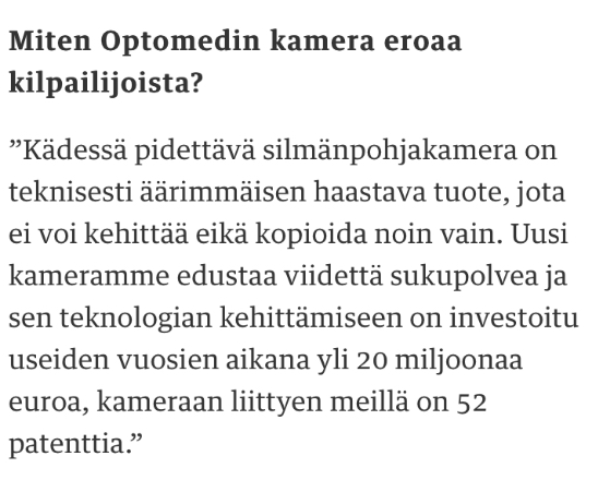 Mä skippasin tän ihan suosiolla. Aika näyttää oliko hyvä päätös. Mielestäni pieni koko ja kuljetettavuus tulee hyödylliseksi vasta kun laitteella on helppoa ja vaivatonta ottaa riittävän hyvä ja laadukas kuva, jota ihmisen lisäksi tekoäly tarkastelee ja antaa vastauksia suoraan. Tarkempi tutkimus esim. Läppärillä. Saattaa vaatia hyvän näytön ellei tekoälyyn voida nojautua suoraan. Tähän päästäkseen tarvitaan hyvää koodia ja optiikkaa. Kuulostaa jo hintavalta ja epäilen, että nykyinen ei ole vielä riittävällä tasolla. Tuossa tapauksessa laitetta voitaisiin käyttää kaikilla liikkuvilla hoitajilla, jolloin globaalisti markkina voisi olla isompi. Hinta kuitenkin olisi sen verran iso, ettei liikkuville hoitajille voitaisi tällaista hankkia. Hyötynä tässä on ainoastaan se, että alkava ongelma voitaisiin tunnistaa esim. Asiakkaan kotona ikään kuin ohi mennen, jos on epäilystä. Muutoin asiakas joutuu kyllä matkustamaan tämän jälkeen edelleen lääkäriin, joka todennäköisesti kuvaisi silmän vielä tarkemmalla laitteella ennen kuin suunnittelee toimenpiteet. Nämä laitteet olisivatkin sitten niitä pöytälaitteita