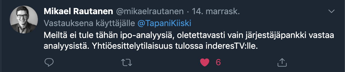 Tässähän vastattiin tosiaan eri kysymykseen. Mulla vähän sellainen kutina, että tää jää merkkaamatta. Katson toki yhtiöesittelyn jne, ja toivon, että ennakkofiilikseni muuttuu. Toistaiseksi tärkeimmät kysymykset ovat jääneet vastauksetta ja se saa mut ajattelemaan, ettei niihin ole rauhoittavia vastauksia.