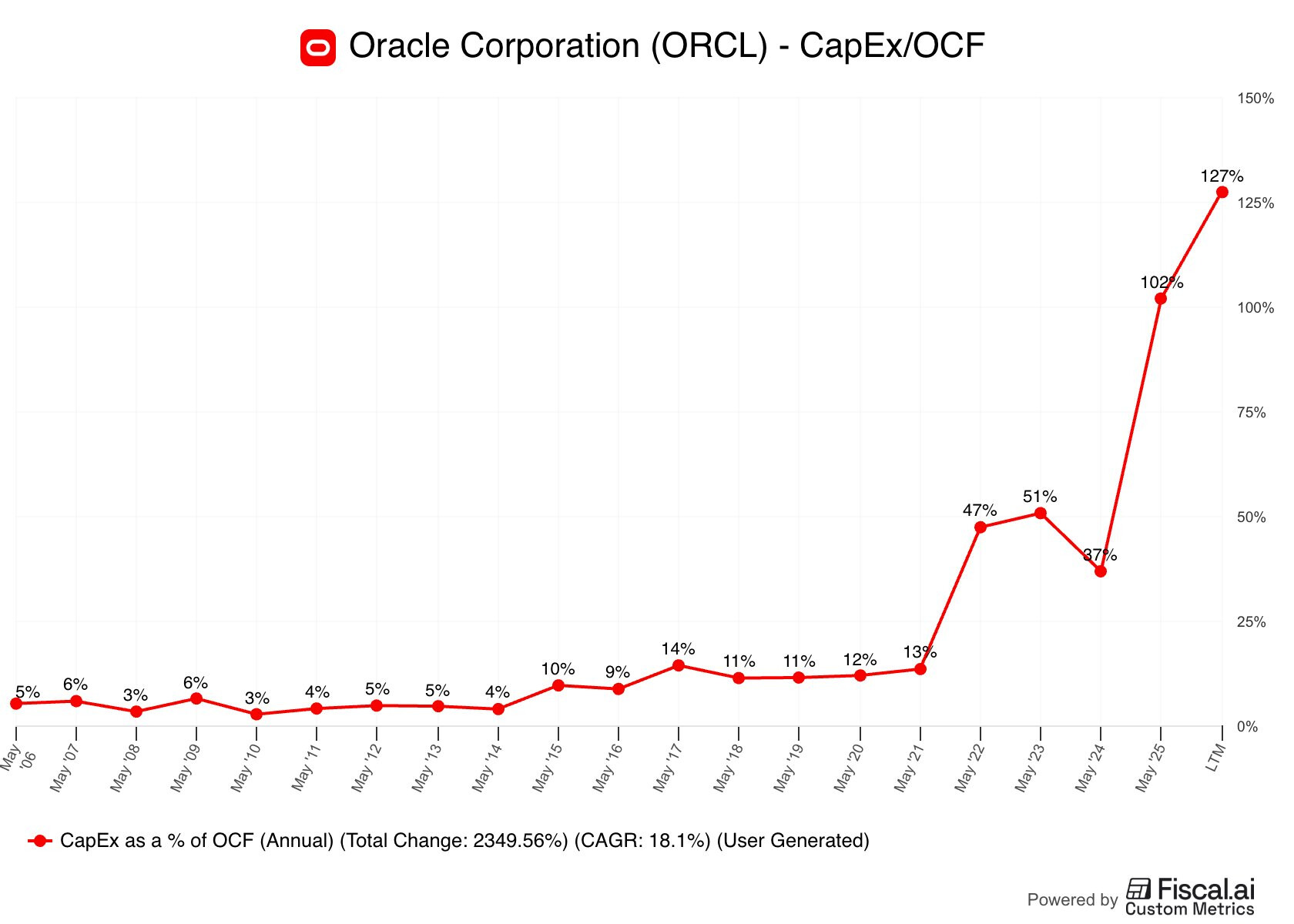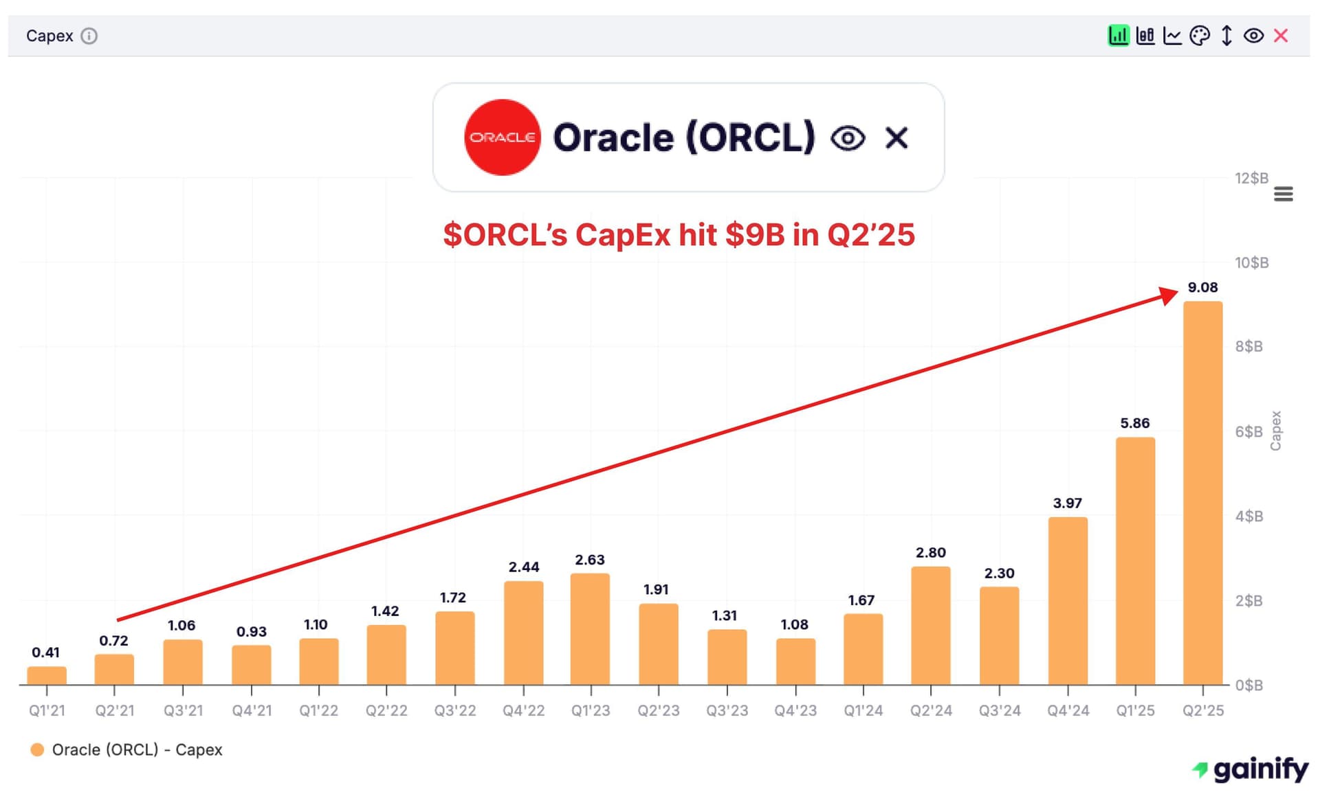 Oracle on kasvattanut investointejaan pilvi- ja AI-infraan hurjasti vuoden 2021 0,8 miljardista dollarista peräti 9 miljardiin (Q2/2025).