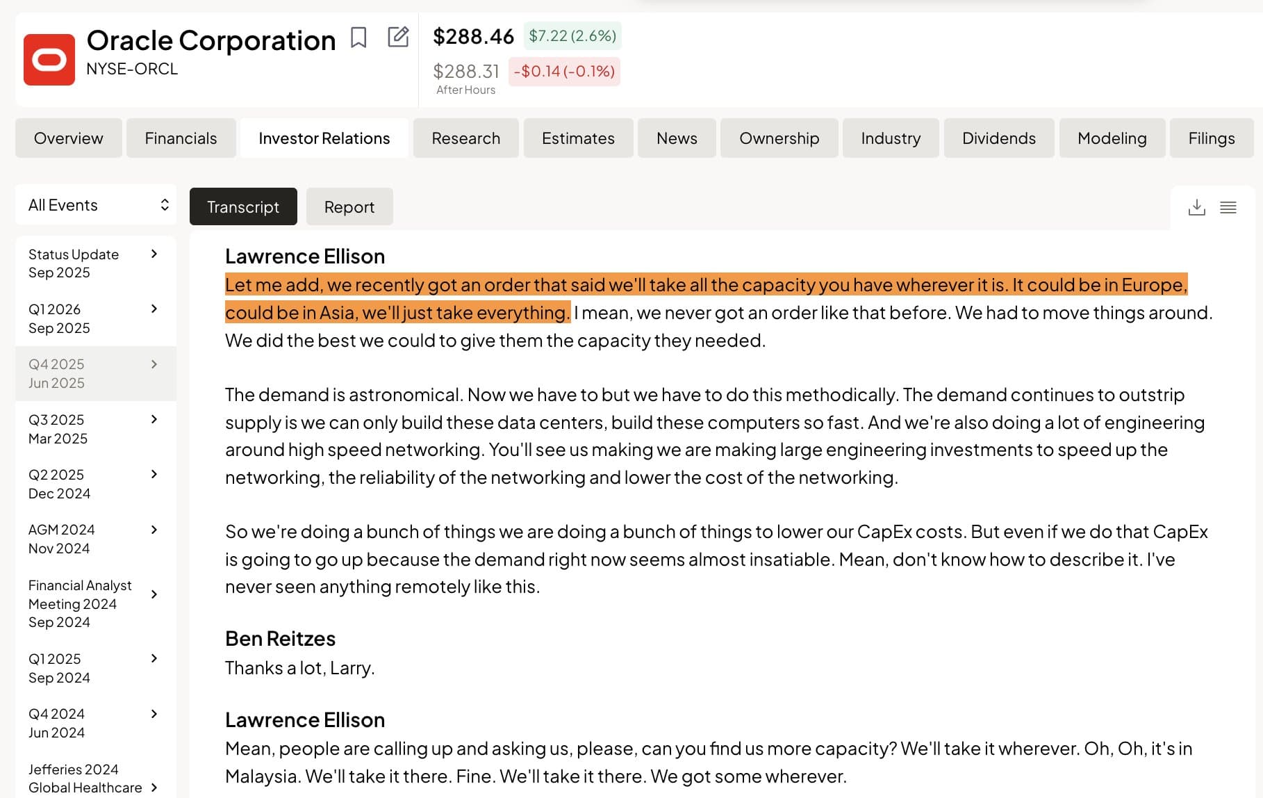 Larry Ellisonin mukaan yhtiö sai tilauksen, jossa asiakas haluaa kaiken kapasiteetin mitä vain löytyy, sijainnista riippumatta. Tilaus kuvannee tekoälybuumin ennennäkemätöntä vauhtia.