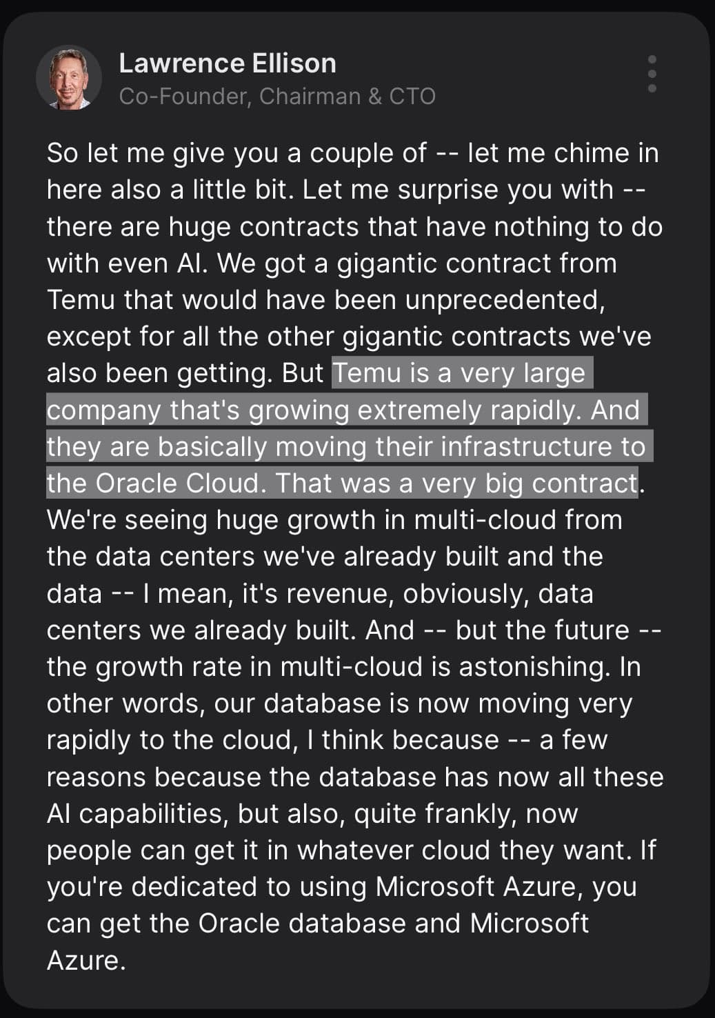 Larry Ellison kertoi, että Temu on hyvin suuri ja nopeasti kasvava yhtiö, joka siirtää käytännössä koko infrastruktuurinsa Oracle Cloudiin. Tämä oli merkittävä sopimus hänen yhtiölleen.