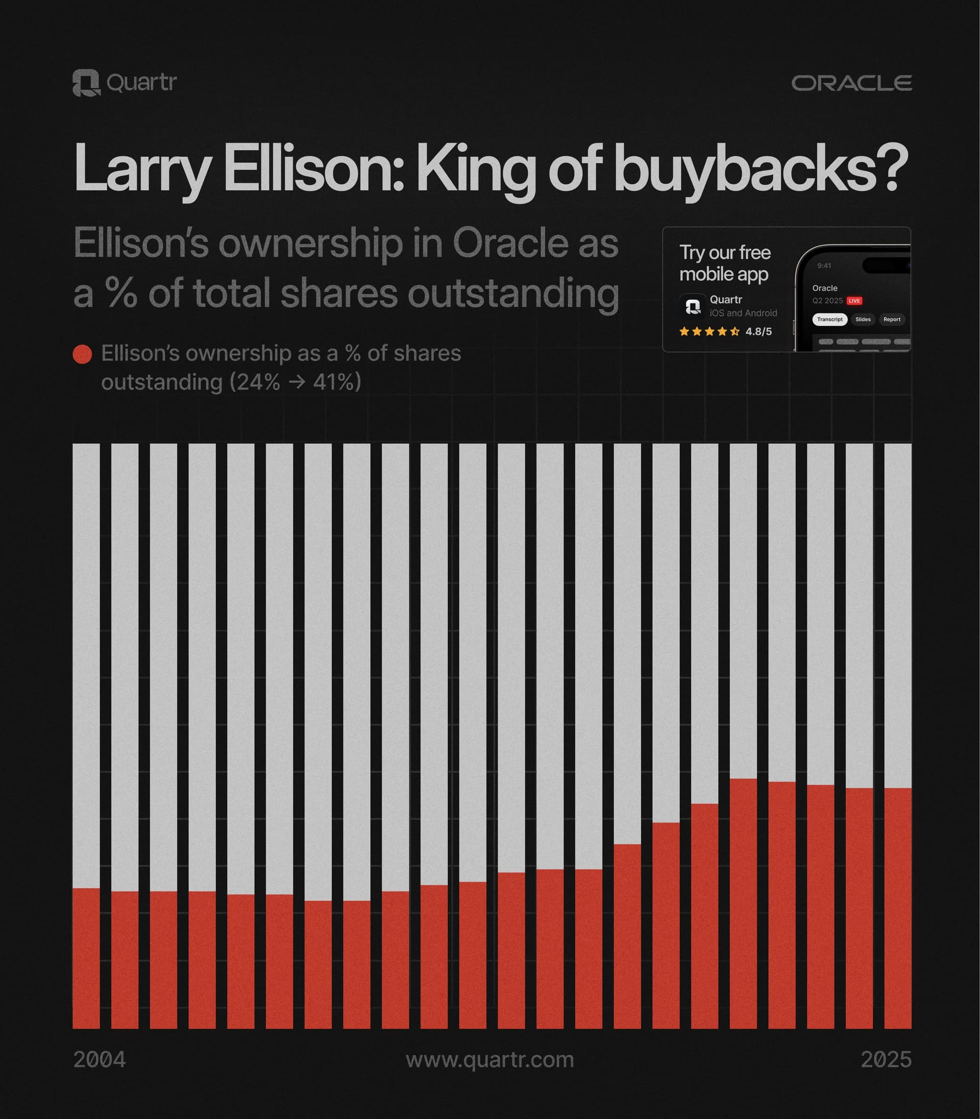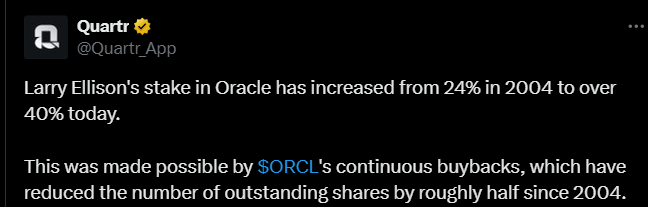 Alla on tviitti siitä, miten Larry Ellisonin omistus Oraclesta on noussut 24 prosentista yli 40 prosenttiin yhtiön omien osakkeiden takaisinostojen ansiosta. Osakemäärä on puolittunut vuodesta 2004 lähtien.