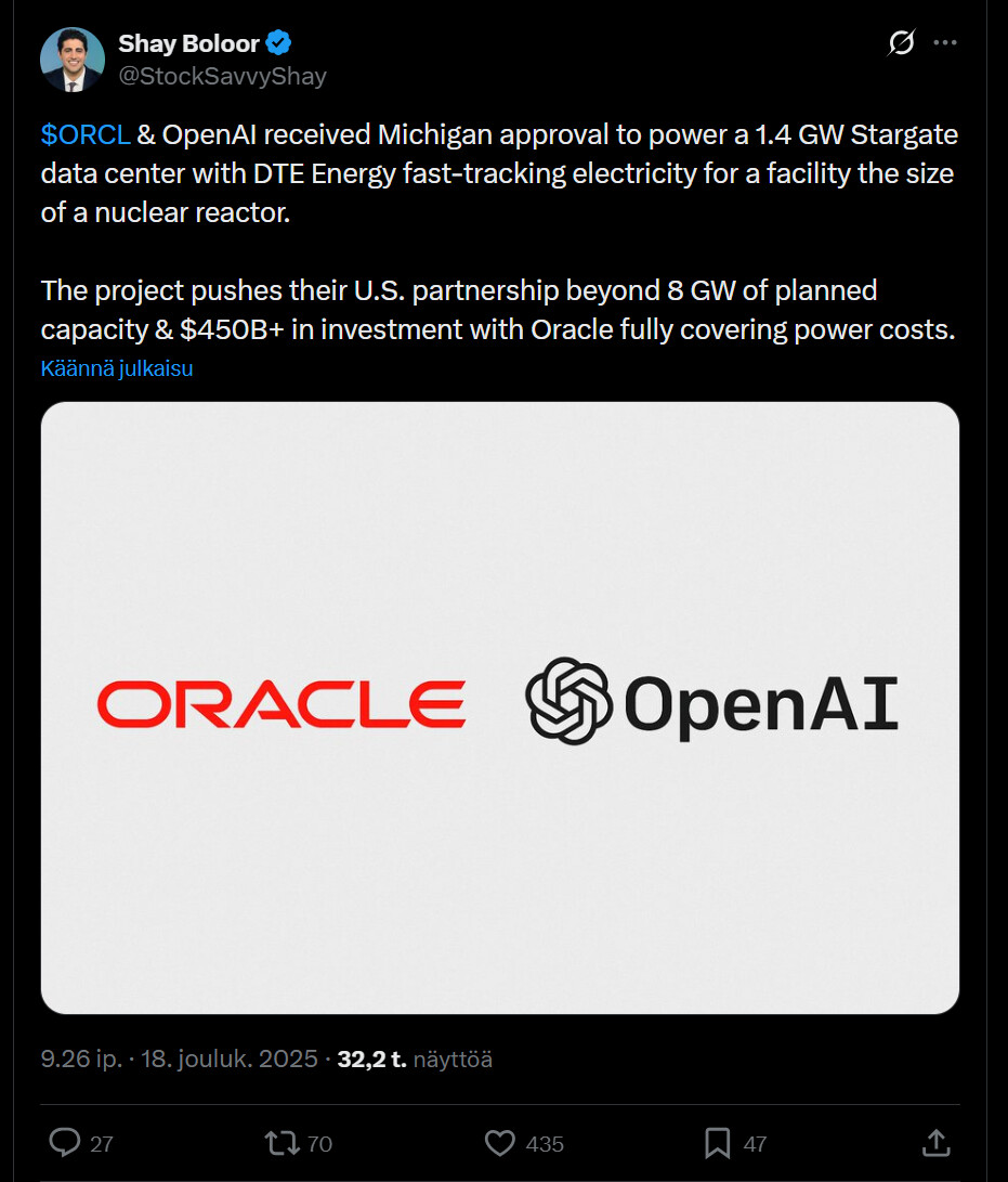 According to the tweet, the scale of the project is comparable to that of a nuclear power plant. Their collaboration in the United States is growing to over 8 gigawatts and $450 billion in investments, and Oracle is responsible for the energy costs.