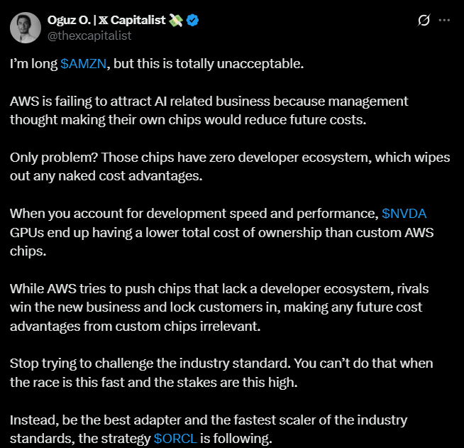 The tweeter is likely pondering that Amazon’s AWS’s own chip strategy weakens its competitiveness and customer flow in AI. Without a broad developer community, cost advantages disappear, and then Nvidia takes the business.