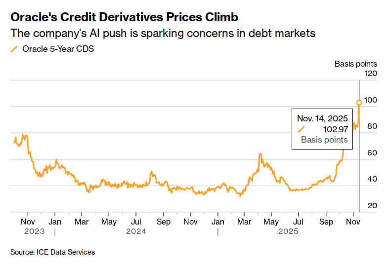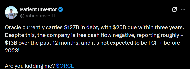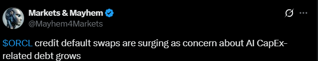 The tweet below indicates that the protection costs reflecting Oracle’s debt risk are rising rapidly.