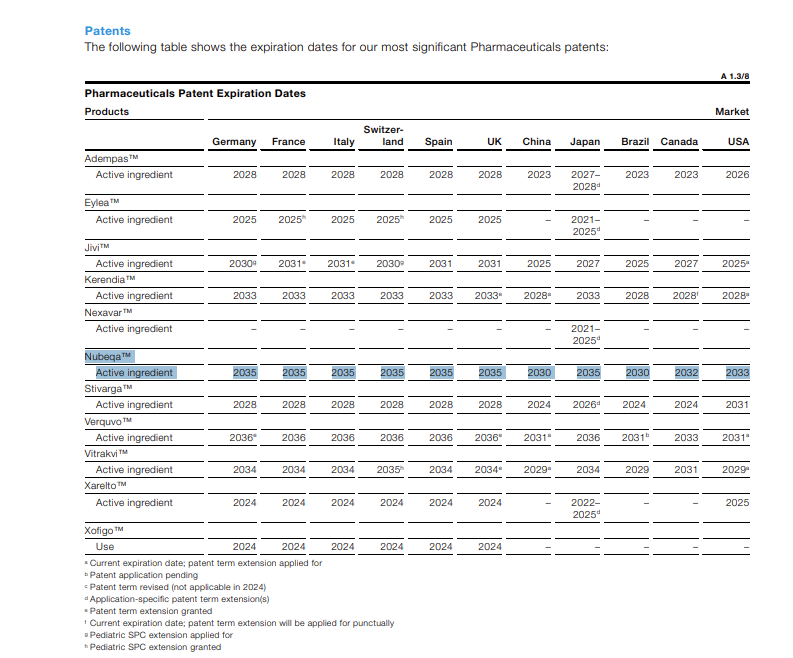 Hei, alla ote Bayerin 2024 vuosikertomuksesta, josta näkyy Nubeqan molekyylipatentin päättymisajankohdat keskeisillä markkinoilla. Tyypillisesti lääkkeille pyritään rakentamaan myös muunlaista patenttisuojaa (kuten esim. formulaatiopatentteja tai käyttöaihepatentteja). Molekyylipatentti on kuitenkin se keskeisin ja vahvin suoja, jonka vuoksi siihen yleensä viitataan.