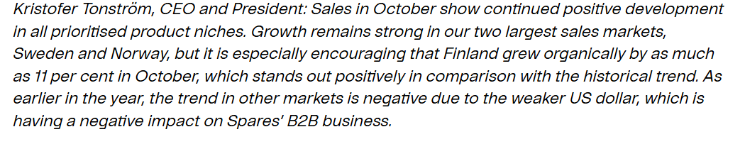 From Clas Ohlson’s latest sales report. Highlighting the CEO’s comment that sales in Finland, in particular, surprised positively. Sweden has had a more buoyant trend for a longer time.