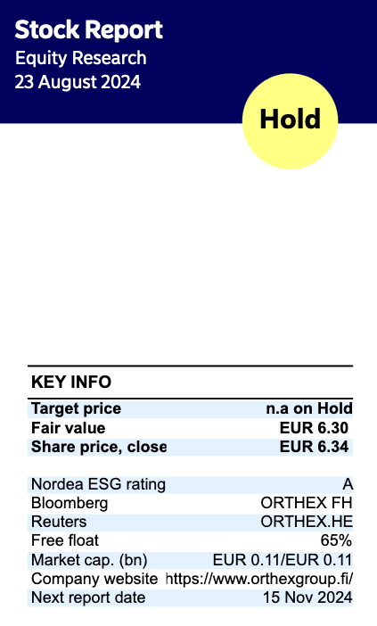 Nordea publicerade sin uppdaterade Orthex-analys. Rekommendationen förblir på BEHÅLL-nivå, fair value preciseras till 6,30 euro (tidigare: 7,10 €).