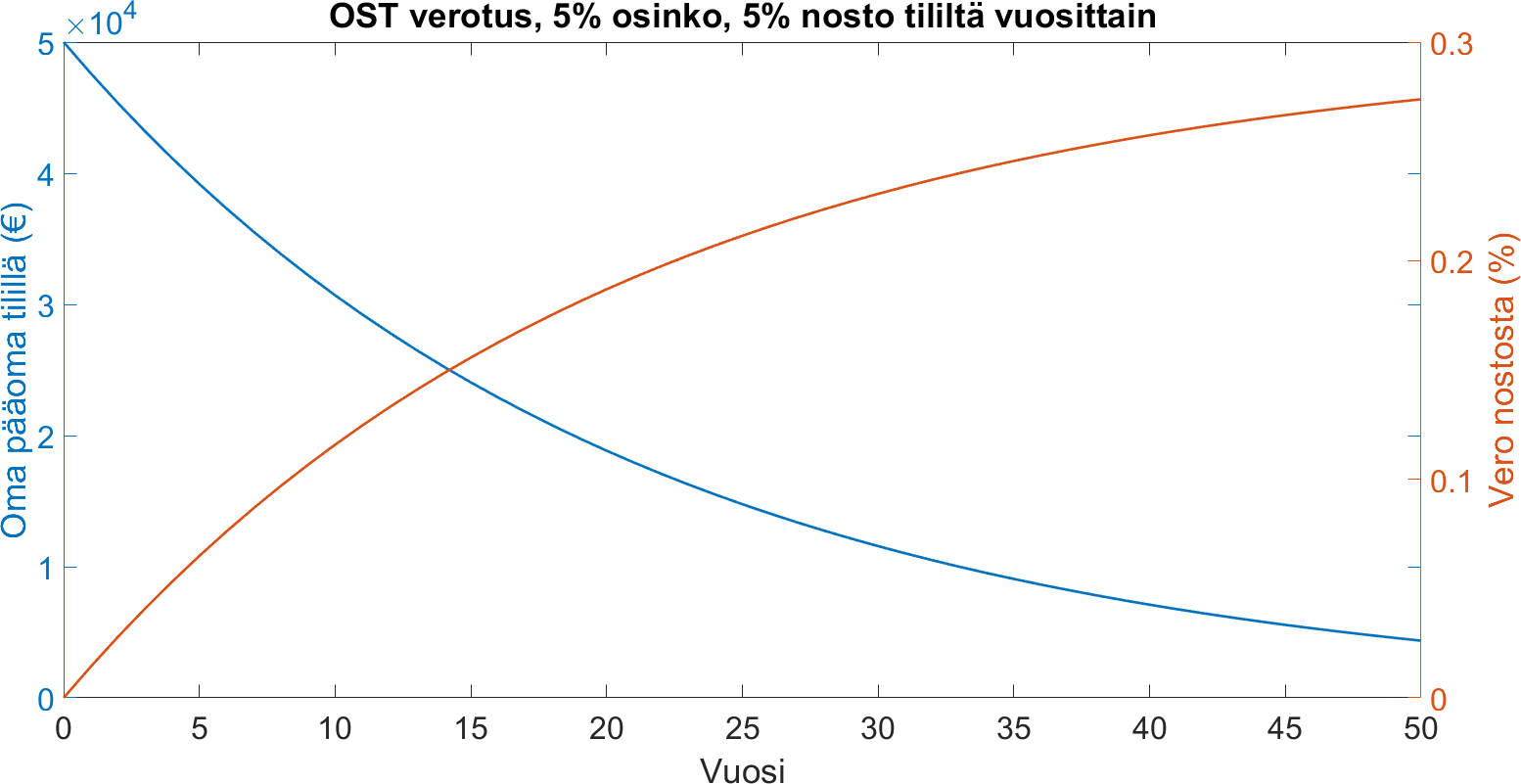 Laskeskelin tuota hieman esimerkkinä 50000€ tilillä, 5% vuotuinen tuotto, joka nostetaan kokonaisuudessaan ulos. Kuvassa oman pääoman kehitys tilillä ja nostosta realisoituva veroprosentti.
