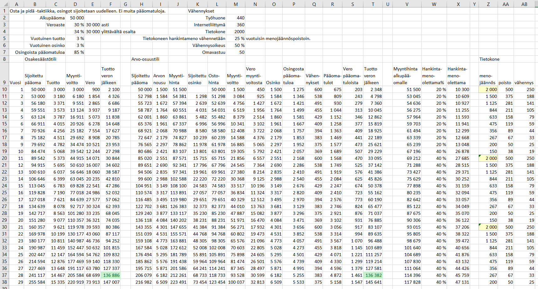-Huomioin laskelmissa, että arvonnoususta 10% osalta maksetaan verot vuosittain. Jonkin verran osta ja pidä sijoittajakin todennäköisesti myy “huonoja” sijoituksia pois ja tasapainottaa salkkua myymällä osuuksia hyvin tuottaneista sijoituksista. Luonnollisesti tämä on huomioitu myös hankintahinnan kasvamisena (vrt. osingot). Esim. ensimmäisenä vuonna maksetaan verot 0,1 * 1500 = 150 euroa osalta ja tämä sijoitetaan uudelleen veroilla vähennettynä (0,7 * 150 = 105 euroa), niin hankintahinta kasvaa myös 105 eurolla.
