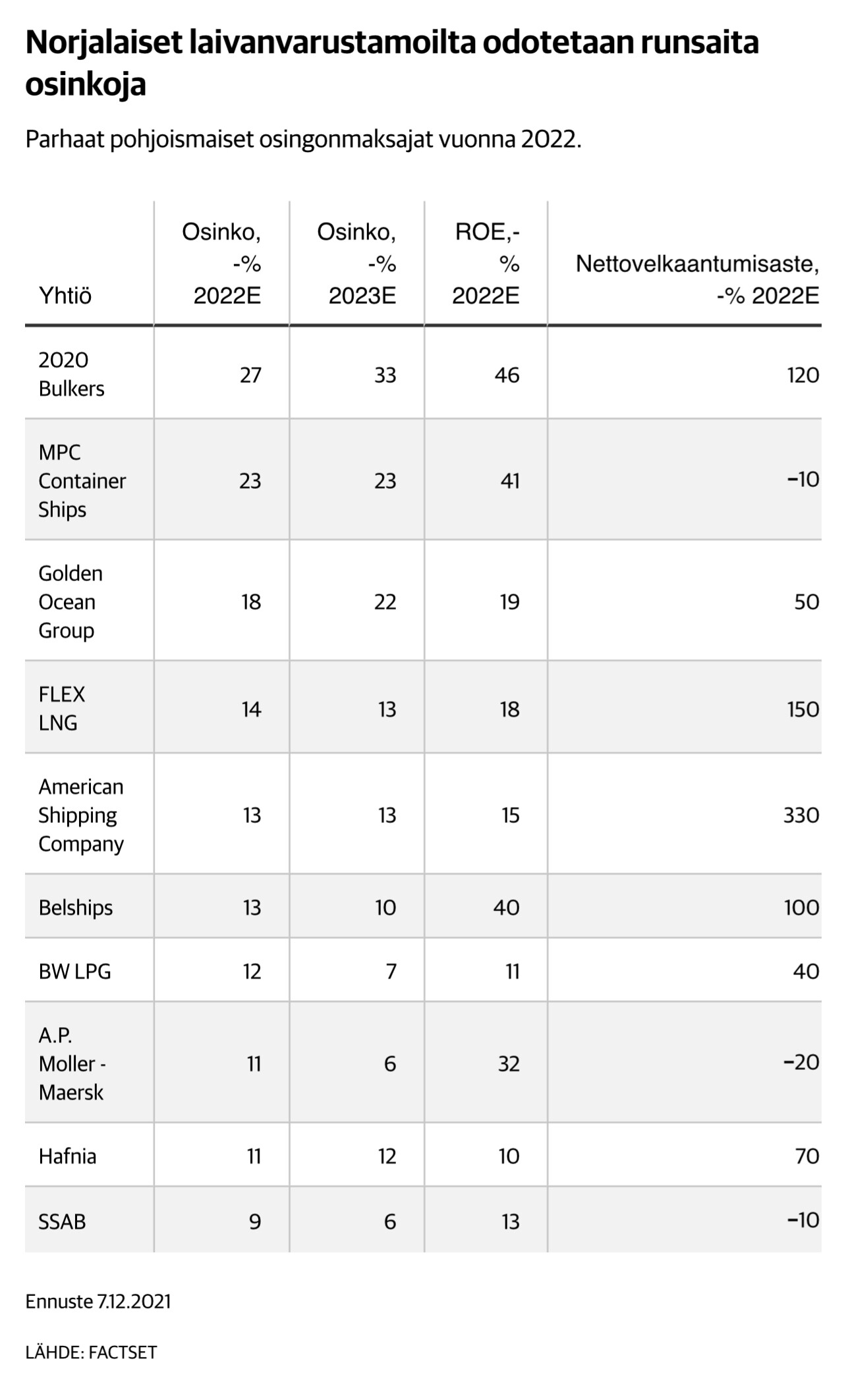 Osinko-osakkeilla voi olla myös eri lähtökohdat eri aloilla. Esim. tuntuu, että tällä hetkellä shipping-yhtiöissä palkitaan osingonmaksukyvystä. Selittyy osittain historialla. Silloin kun yritykset tekevät parhaat voittonsa, on keskimäärin heikoin hetki sijouttaa voittovarat uusiin investointeihin eli aluksiin. Kun kaikki investoivat liikaa, kohta kaikki tekevät isommalla laivastolla isompaa tappiota markkinoiden ylitarjonnasta johtuen. Siksi esim. tuossa yllä näkyvässä listauksessa Norjan kohdalla näkyvä 2020 bulkers pyrkinyt vastustamaan investointikiusausta ja jakamaan voitot ulos osinkoina. Sijoittajat sitten palkitsevat yhtiön arvostuksella, joka on jopa yli NAV, mikä ei päde moniinkaan sektorin muihin yrityksiin. Eli sijoittajat näkevät, että osinkoa maksavissa yhtiöissä on johto, joka ei pilaa osakkeen omistajien tuottoa huonoilla päätöksillä. Kertoo toki jotain shipping-alasta ylipäätään.