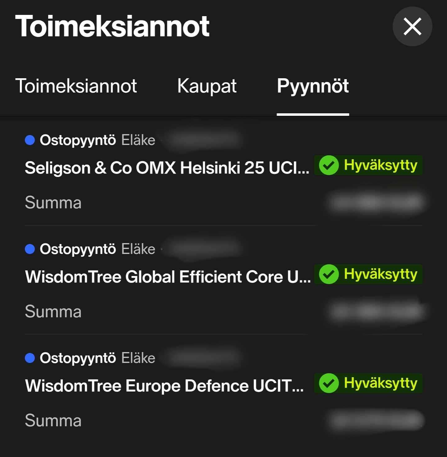 Toissapäivänä Saab:in ylisuureksi paisuneesta positiosta höylätty 30 pinnaa, josta tänään saapuneilla fyffeillä lisätty Wisdomtree europe defence ETF:ää, joka kylläkin myös sisältää saab:ia, mutta myös kaikkee muuta kivaa…