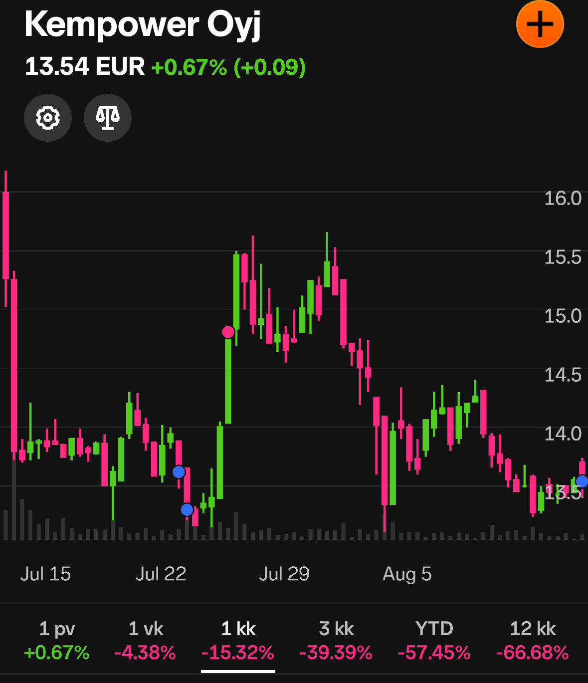 Lähdetty uudestaan Kempowerin kyytiin 600kpl @ 13,53€. Taitaa pikkuhiljaa olla negatiivinen sentimentti kurssissa niin koitetaan vähän pohjien kalastelua. Stopparinkin saa hyvin lähelle. Kyllä ne korot sieltä laskee, sähköistyminen edistyy ja laturit lisääntyy.