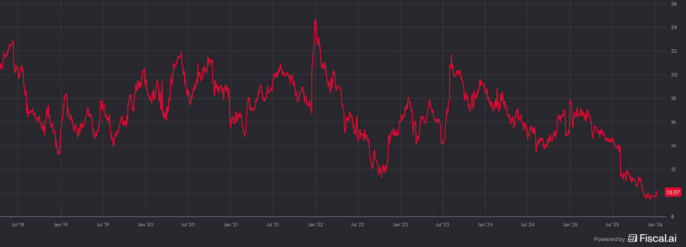 Alennuksessa. Sekä P/E että EV/EBIT ovat ensi vuodelle painuneet historiallisiin pohjiin. Kun viimeisen kymmenen vuoden aikana eteenpäin katsova P/E on ollut välillä 16-18x, niin vuoden alussa oltiin jo alle 10x.