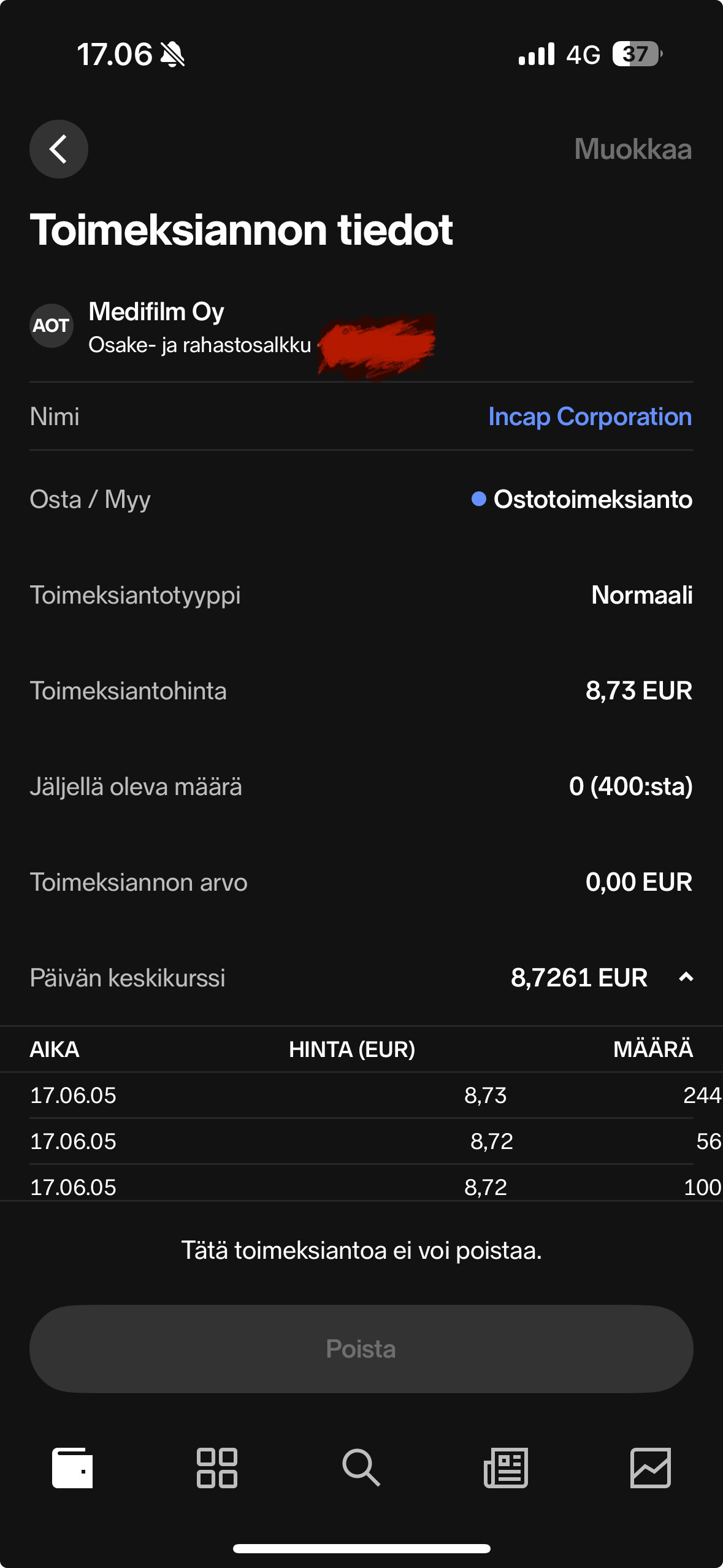 I går blev de resterende Honkarakenne-beholdninger på Aktiesparekontoen solgt til en gennemsn