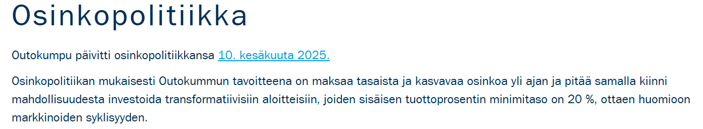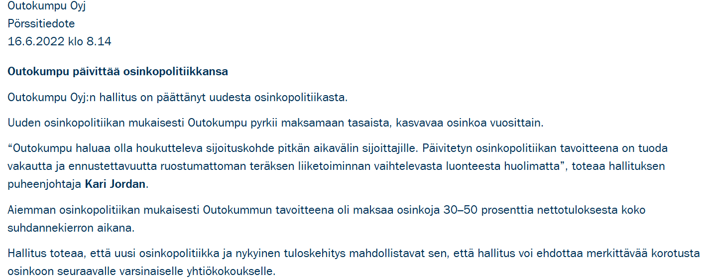 Själv spelar det ingen roll i vilken form avkastningen kommer (kurs / återköp av egna aktier / vinsttillväxt / utdelningar), men jag anser nog att Outokumpus utdelningspolicy har utsatts för lite väl mycket trixande.
