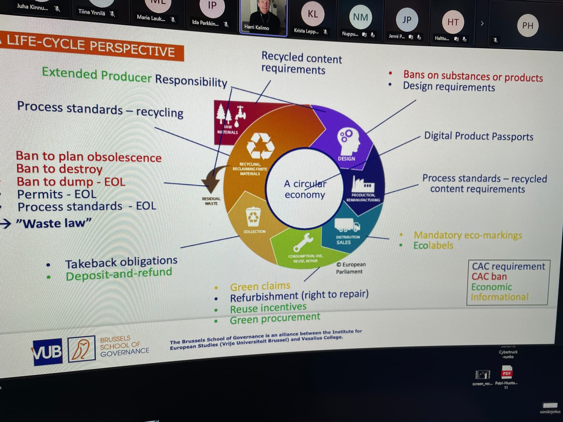 - Ban to plan obsolescence / Ban to destroy / Ban to dump – EOL / Permits – EOL / Process standards – EOL / “Waste law” (Kielto suunnitellulle vanhenemiselle / Kielto tuhota / Kielto kaatopaikalle – elinkaaren loppu / Luvat – elinkaaren loppu / Prosessistandardit – elinkaaren loppu / Jätelaki)