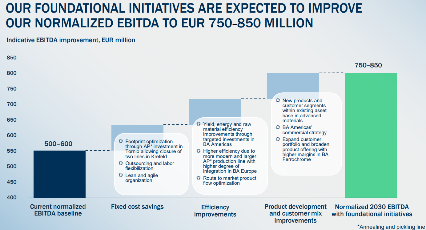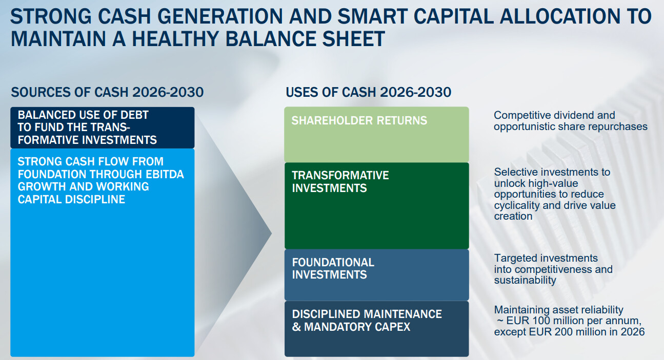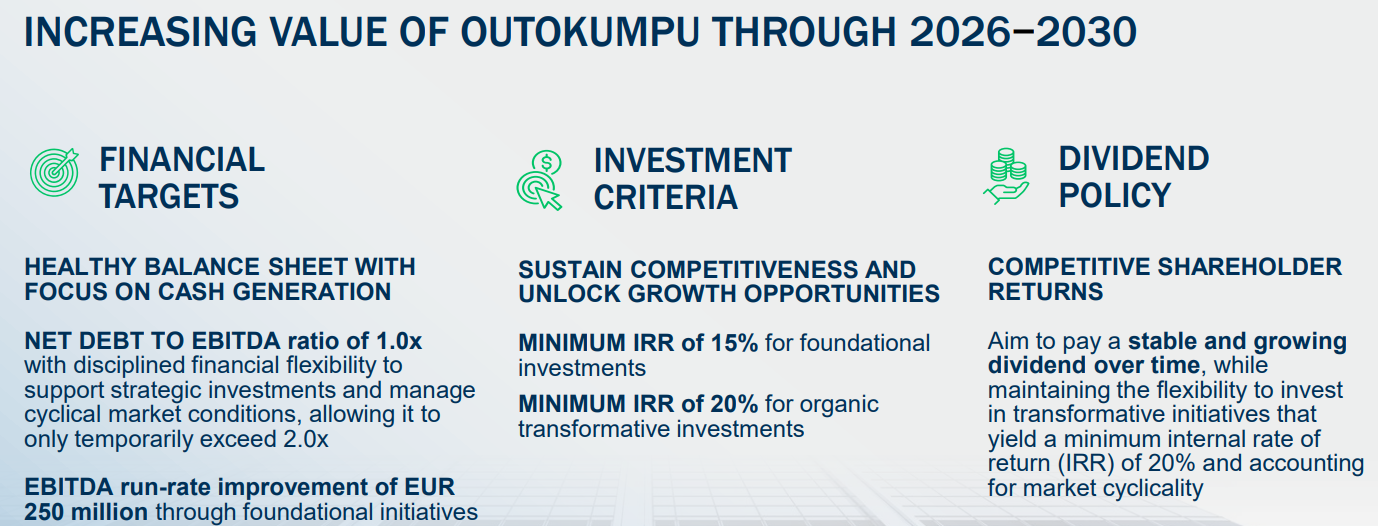 Huolimatta tuntuvasti laskeneista ennusteistamme on lähivuosien kokonaiskuva säilynyt ennallaan – odotamme teollisuuden investointiaktiviteetin ja kuluttajakysynnän elpymisen vahvistavan ruostumattoman teräksen markkinaa sekä Euroopassa että Pohjois-Amerikassa. Euroopassa markkinaa avittaa komission toimien seurauksena supistuvat tuontikiintiöt ja USA:n markkinaa suojaa paikalliset tullit. Näiden tekijöiden ansiosta odotamme myös Outokummun saavuttamien keskihintojen kohoavan, mikä tukee sen tuloskuntoa. Näitä samoja ajureita heijastellen ovat vuosien 2026-2027 oikaistun käyttökatteen ennusteemme noin historiallisen yli syklin katsovan tulostason mukaisia.