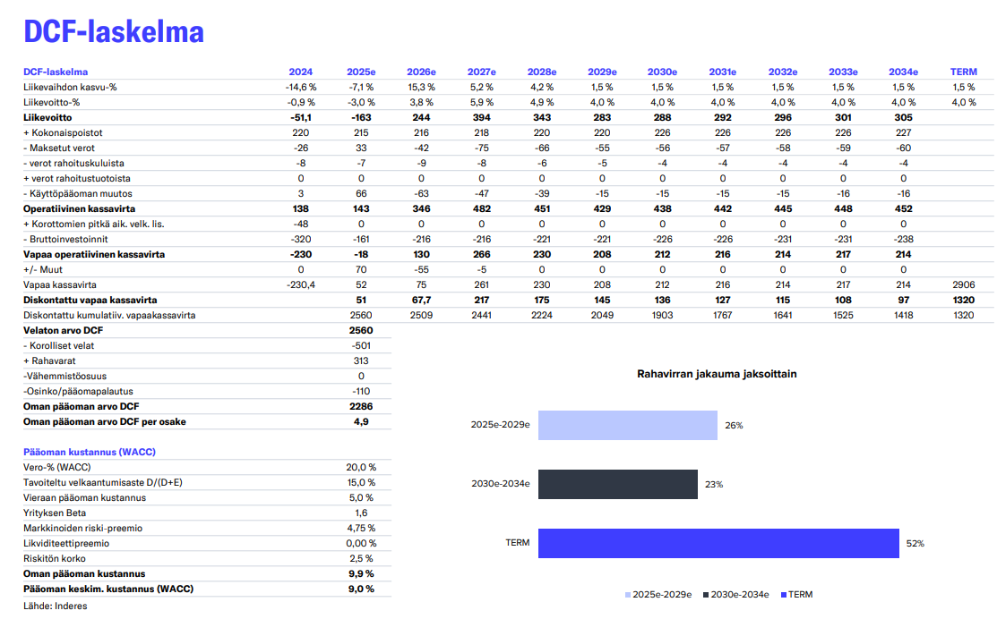 Inderesin DCF-laskelman mukaan tulevien kassavirtojen fair value on luokkaa 4,9 eur, eli sanotaanko 10 vuodessa +20% verrattaessa päivän kurssin 4,00 eur, ts muutama reaali% per vuosi, toki omalle pääomalle lasketaan tässä 9,9% korko