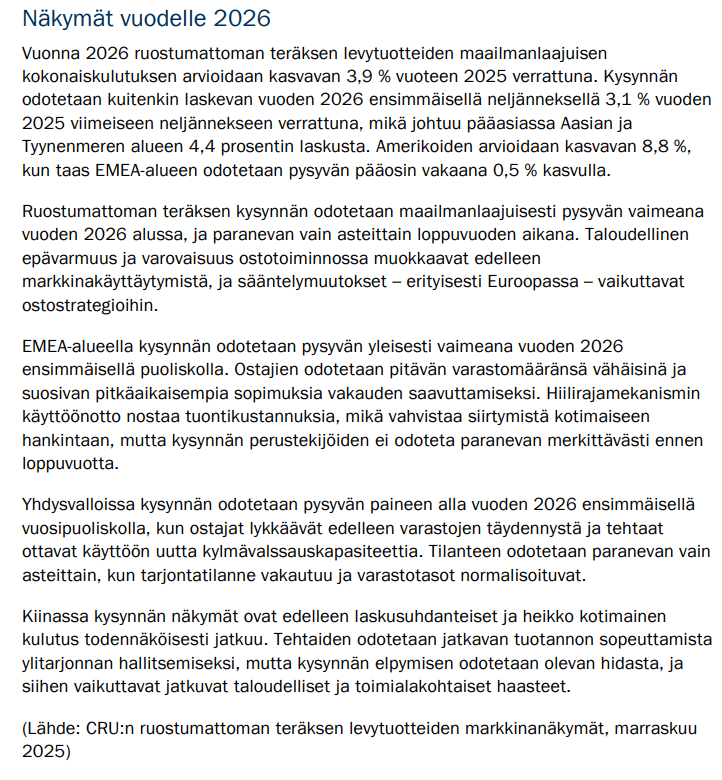 Aperam släppte sin Q4-rapport i morse. Deras verksamhet i Sydamerika försvårar jämförelsen med Outokumpu, men även de beklagar bristen på efterfrågan och det kraftiga importtrycket. Uppenbarligen har importtrycket ökat i slutet av 2025. Det är ju i viss mån logiskt att importörer har tagit in större volymer innan CBAM träder i kraft, och detta kan få effekter som spiller över ända in i början av 2026.