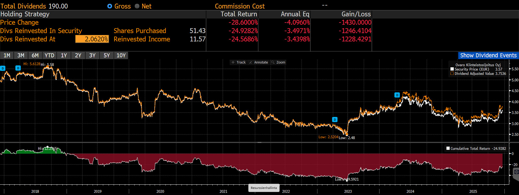 Markkinan mielestä oli selkeästi hyvä uutinen, kun pitkään mörninyt kurssi nousi melkein 7.5 %, mutta… Kun P/B-arvo on noin matala kuin on, omien osakkeiden osto olisi tuntunut minusta fiksummalta tavalta jakaa varoja, jos niitä nyt ylipäänsä oli tarpeen tässä vaiheessa jakaa eikä käyttää velkojen maksuun tai jättää reserviksi uusille hankkeille. Lähinnä tästä tulee mieleen Investor Housen loppukesän järjetön osinkouutiseen perustuva kurssipomppu, toki pienemmässä mittakaavassa. Vaikka kohtalaisessa määrin omistamani osakkeen kurssi nyt nousikin, en oikein osaa iloita, kun a) yhtiön hallitus teki minusta hölmön esityksen ja kun b) markkina reagoi siihen minusta hölmösti. No, ainahan voisi keventää omistusta ja ostaa tilalle vaikka Asuntosalkkua tai Kojamoa… Mutta ehkä vielä seurailen tilannetta, kun ei se Ovaro vieläkään kallis ole.