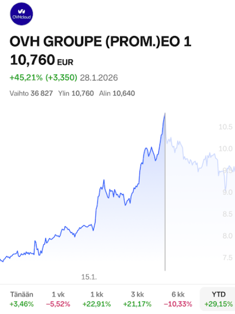 Som ekonomistudent har jag mycket svårt att förstå hur tre teknikjättar gör så stora vinster med molntjänster. Enligt ekonomiska teorier, om en bransch har så stora vinster tack vare investeringar i datacenter, borde andra företag komma in på marknaden, och med tiden skulle marknaden fördelas mellan flera företag. Jag diskuterade ämnet på jobbet med en utvecklare som tidigare arbetade som molningenjör på ett stort finskt företag. Enligt honom kan stora företag betala över en miljard euro per år för molntjänster, men enkelheten driver dem till att använda Google, AWS eller Azure. Företag kan ha över 200 programvaror tillgängliga, och när man väl har flyttat till molnet är det svårt att byta leverantör, eftersom all programvara skulle behöva flyttas till en annan leverantör igen. Företag kan också samtidigt köpa andra tjänster/programvaror från Google, Microsoft eller Amazon, och vissa program är mer kompatibla med teknikjättarnas egna molntjänster. Små företag har å andra sidan färre programvaror i bruk, vilket gör det lättare för dem att köpa tjänster från den billigaste leverantören, och de kan lättare byta leverantör. Därför har OVH Group särskilt lyckats få små företag som kunder. Visst är konkurrensen hårdare för små företag inom molntjänster, men molnmarknaden växer i så snabb takt att jag är försiktigt intresserad av OVH Group. Dessutom, när OVH Group växer, kan det börja konkurrera om samma kunder som de tre stora teknikjättarna. Inom den offentliga sektorn tror jag att OVH Group särskilt kommer att klara sig bra, nu när Europa har vaknat upp till vikten av datasuveränitet.