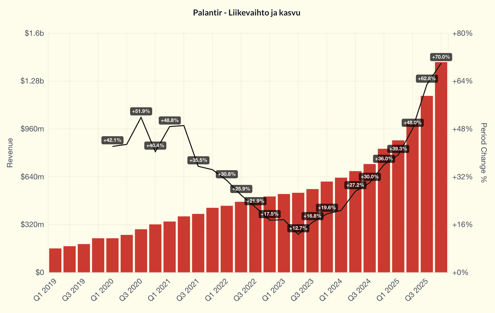 On kyllä raikasta seurata Palantirin polkua, jossa AI:lla tehdään konkreettisia asioita; eikä pelkästään optimoida mainontaa. En tiedä mikä muu AI-yhtiö on mennyt niin syvälle mekaanisen valmistuksen prosesseihin, kuin Palantir tekee nyt. Navyn kaupassa on tuotantotaloudellisen kulman lisäksi merkittävä turvallisuuspoliittinen kulma. USA:lla ei ole riittävästi laivoja Kiinan haastamiseen merillä. Ei kyllä heti tule mieleen, että laivanrakennusta kiihdytetään AI:lla, mutta siitähän on nyt kyse. Ja Palantirin laskut ovat pyöristysvirhe, kun nipuetaan mitä sukellusveneet, lentotukialukset ja kaikki pienemmät paatit maksavat. En ihmettelisi, vaikka Palantirin laskujen takaisinmaksuaika olisi vain kuukausissa per paatti. Ja voihan joku muukin maa, esim. Korea, Japani jne. seurata Navyn esimerkkiä nopeuttaa tuotantoaan.