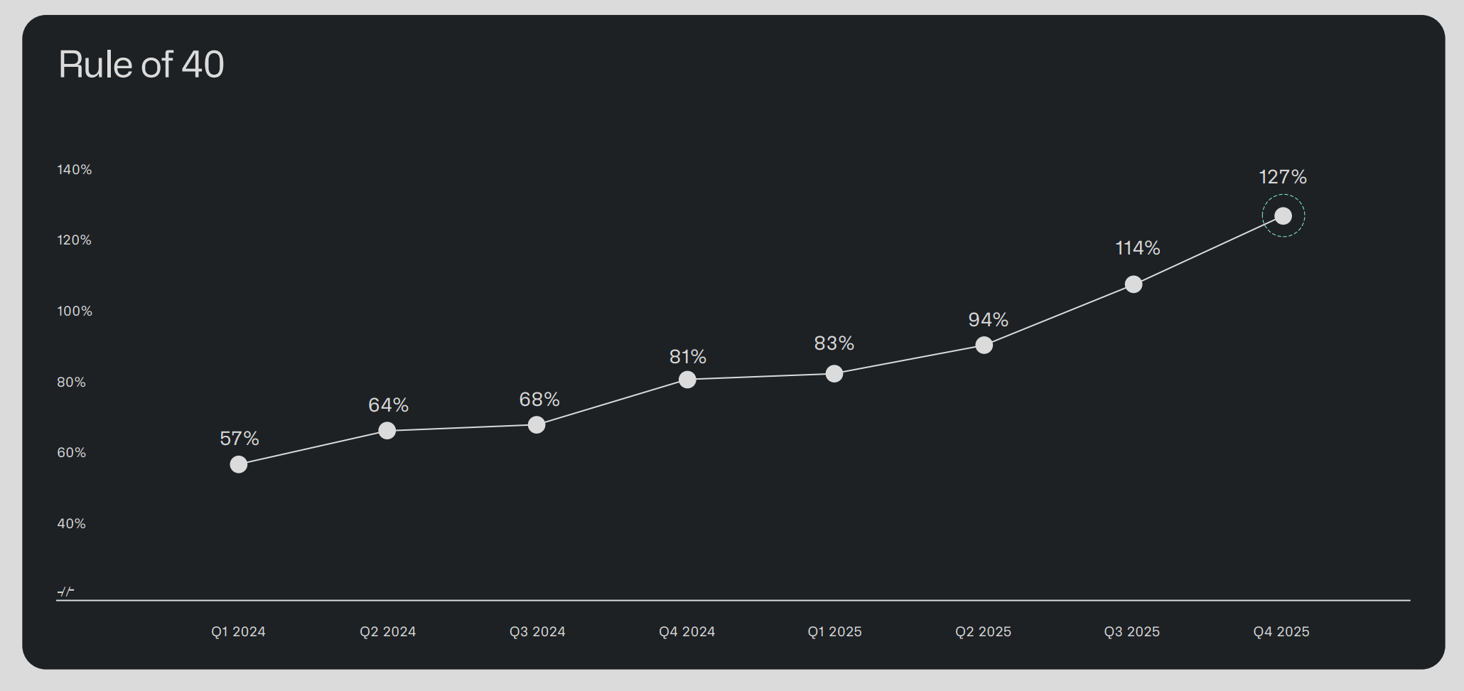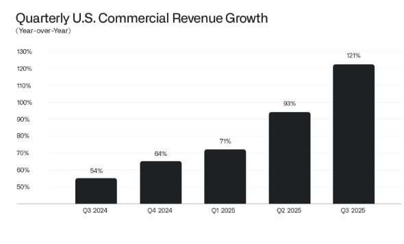 Eli vaikka ei yhtään uutta asiakasta tulisi, kasvaa nykyasiakkaitten ostot nyt 34% vuositahtia. Eli yhtiö kasvaa nyt hyvin, ja kasvu voi olla kiihtyvää, koska USA:ssa yksityisen sektorin kasvu on räjähtävää, 121% q3 2025.