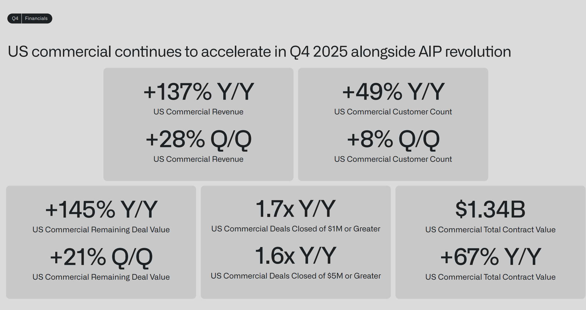Palantir on tällä hetkellä täysin USA-vetoinen tarina. Yritysasiakkaiden lukumäärä USA:n ulkopuolella jopa väheni 3 kappaleella Q4:llä. Mutta eipä markkina tuosta taida juuri nyt välittää, kun kysyntää näyttäisi pelkästään Amerikassa olevan enemmän kuin tarpeeksi. Loistava yhtiö kyllä, kuten taas luvuista nähtiin, mutta aika älytön on valuaatio myös.