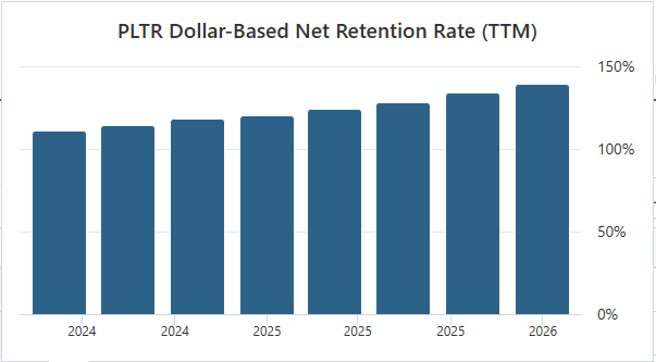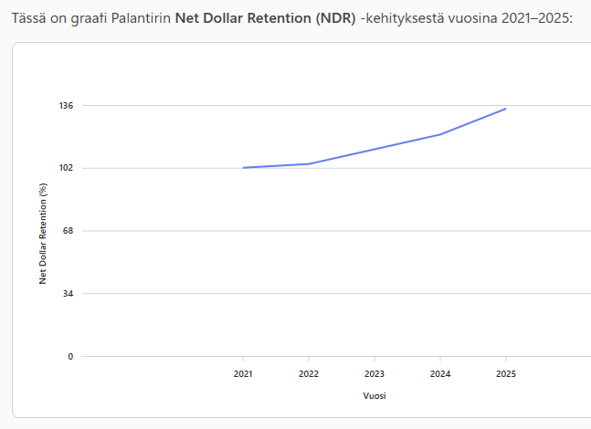 Palantirin net dollar retention rate kertoo sen, miten paljon nykyiset asiakkaat kasvattavat vuodessa ostojaan. Arvo on nyt 134% (q3 2025).