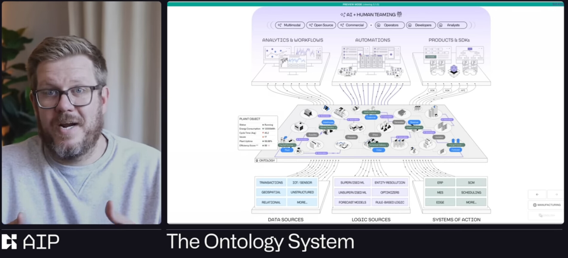 Chad on Palantirin IT-arkkitehti. Hän on myös Palantirin softan tulkki suurelle yleisölle. Nyt hän on tehnyt videon (linkki alimpana), jossa hän kertoo mistä Palantirin IT-palvelussa on kyse. Ei ole pitkä video, mutta menee suoraan asiaan, eli siihen miten Palantirin lisäarvo rakentuu. Yritän asian sanoittaa itse: Palantir mallintaa ensiksi objektit (datat), eli asiat joilla monta ulottuvutta; autolla voi olla hinta, paino, nopeus, henkilömäärä, polttoaineen kulutus jne. Tässä käytetään object oriented mallinnus-tapaa. Ei mitään rakettiteidettä. Sitten kielimalleja hyödytäen Palantir hakee ja selvittää kaikki säännöstöt (logikka) eri paikoista (excelit, koneoppimismallit, työnkulkukuvat jne.). Ei siis mitään rakettitiedettä. Sitten Palantir selvittää kaikki asiat ja toiminnot, jotka laittavat yrityksen pyörimään, esim. tunnistetaan myynti-tilaus-toimitusketjut, huolto- ja varaosatoiminnot. Ei siis mitään rakettitiedettä.