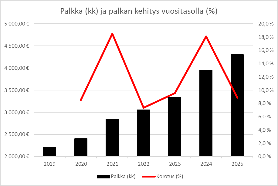 Palkka tällä hetkellä 5000€/kk eli ei yleiskorotusta enempää näkynyt lisää tänä vuonna.