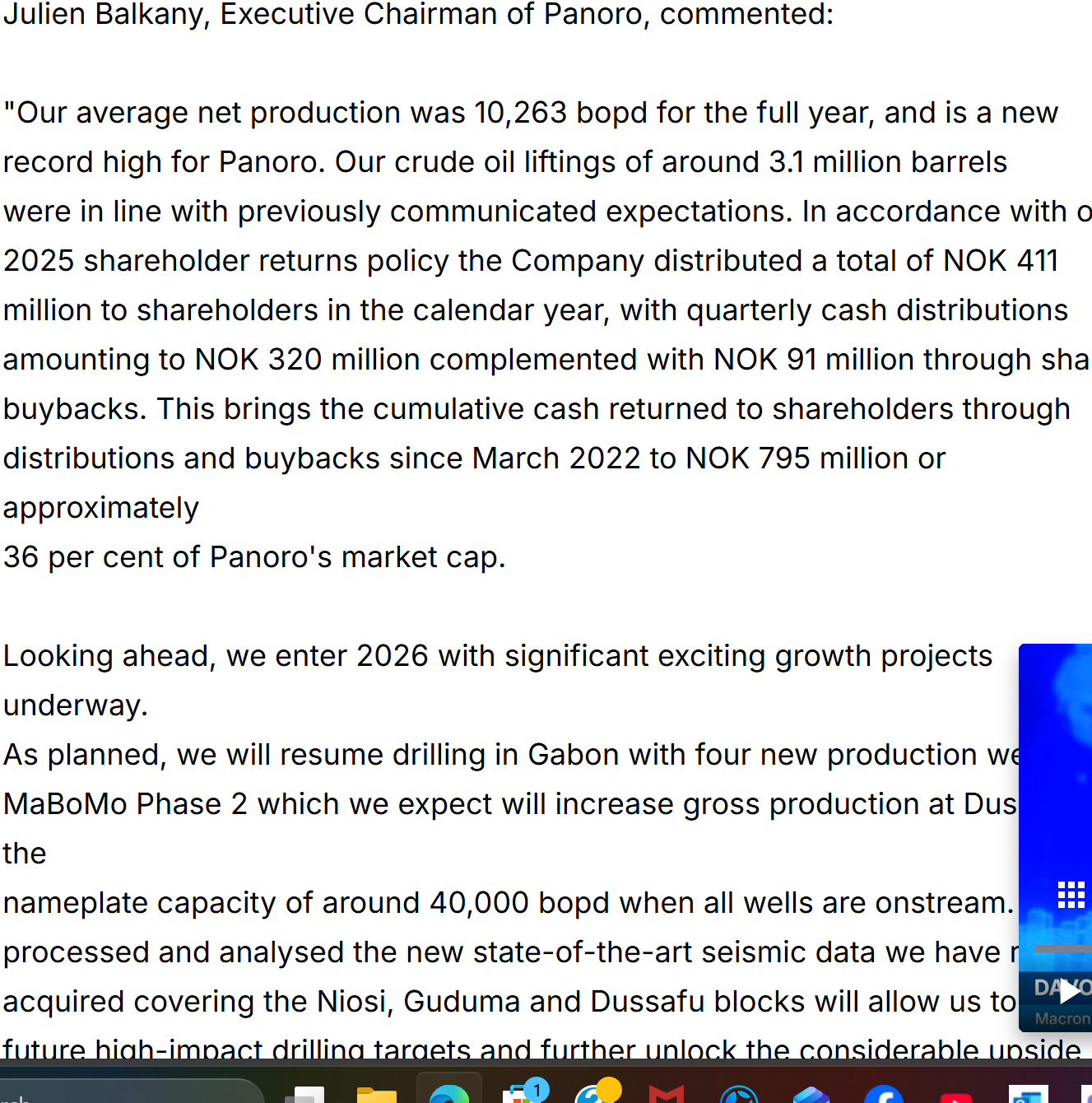 Hvad tænker I om Panoros evne til at skabe afkast til aktionærerne i 2026? Hvad er jeres mening om afrikansk olie i den nuværende verdenssituation? Selv tænker jeg håbefuldt, at dette giver oliesikkerhed til Europa (også PNOR) i en situation, hvor forskellige globale blokke hamstrer olie med henblik på selvforsyning. Europas egne ressourcer (ekskl. Rusland) er vist utilstrækkelige, så hvad angår olie, bliver vi nødt til at dække behovet fra andre blokke – til en premium-pris?