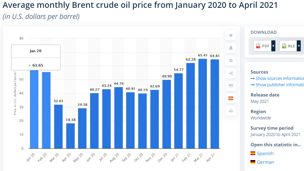 The average 2021 annual price of Brent crude oil climbed to 61.82 U.S. dollars per barrel, as of April. This is roughly 20 U.S. dollars higher than the annual average in 2020, when weakened demand during the coronavirus pandemic resulted in an oil crisis. Brent is the world’s leading price benchmark for Atlantic basin crude oils. Crude oil is one of the most closely observed commodity prices as it influences costs across all stages of the production process and consequently alters the price of consumer goods as we