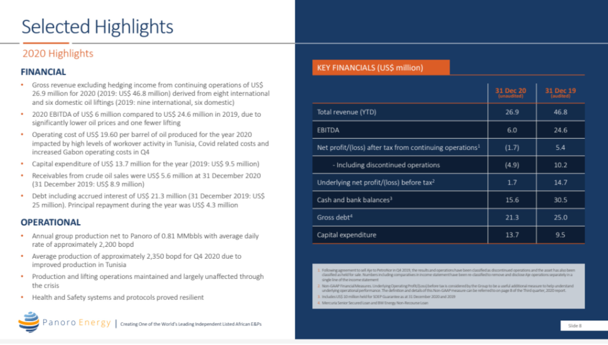 Kaupat on sovittu niin, että kun kaikki hyväksynnät saadaan, niin 1.7.2020 lähtien Panoro on efektiivisesti Tullowin paikalla. Tstä on tulossa mun laskujen mukaan noin 27 MUSD lisätienistejä H2 2020. Panoro ei ole vielä julkaissut tilinpäätöstä 2020, juuri tästä johtuen. Luvut muuttuvat kun kauppa saa kaikki vahvistukset. Tullowin yhtiökokous antoi hyväksyntänsä viime viikolla. Kauppasumma on 140 MUSD ja 40 MUSD ehdollisena myöhemmin, riippuen tuotoista ja öljyn hinnasta. Rahoitus hoidettiin ottamalla lainaa 90 MUSD ja 70 MUSD suunnatulla annilla.