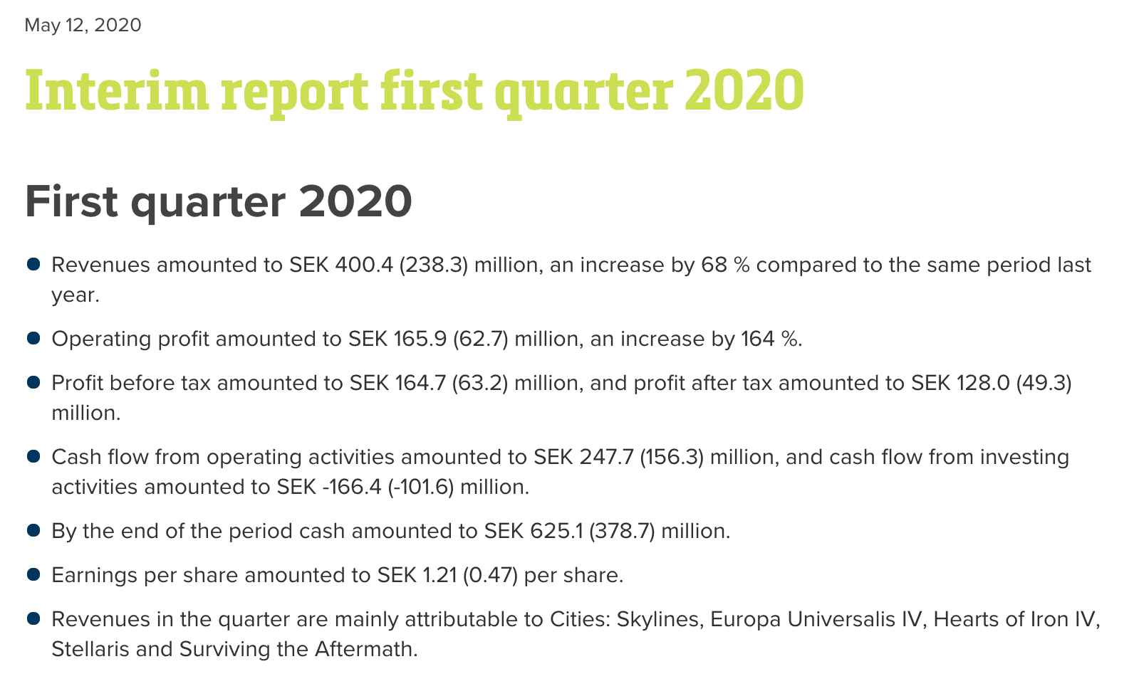 Tässä vielä linkki yhtiön sijoittajasivuille Investors - Paradox Interactive