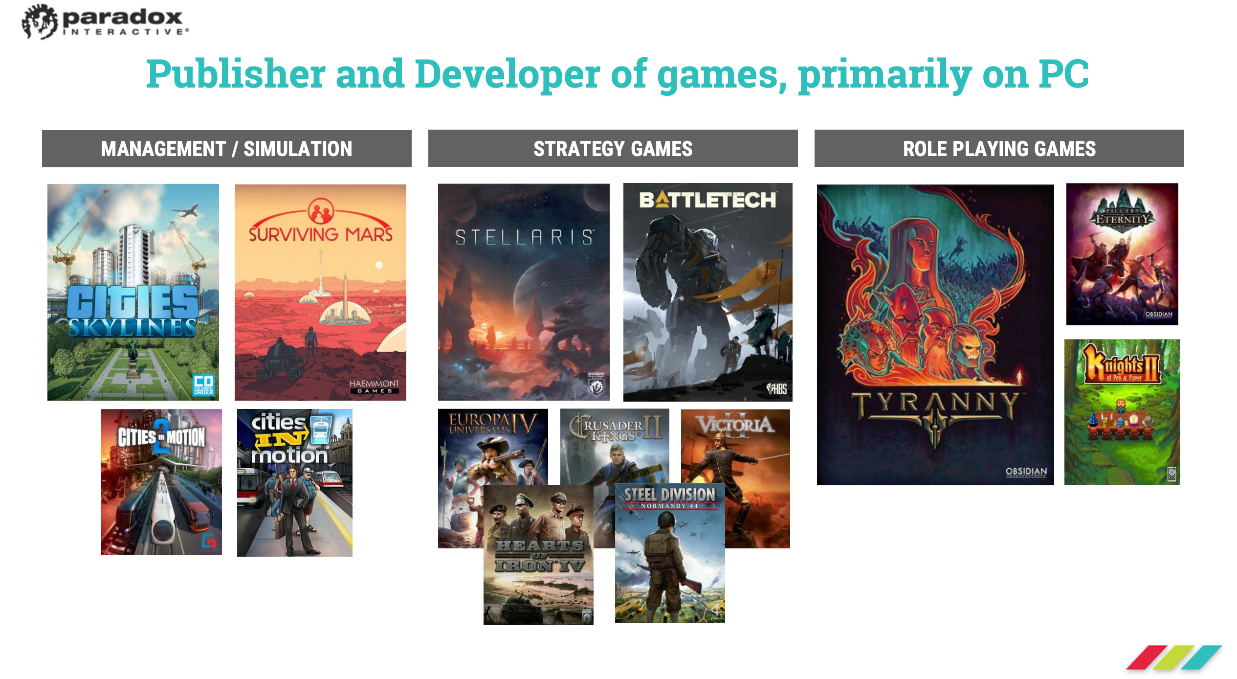 Ruotsalainen Paradox Interactive on strategia- ja roolipeleihin keskittyvä pelikehittäjä ja -julkaisija. Pääalusta on PC. Tunnetuimpia pelisarjoja ovat Crusader Kings, Europa Universalis ja Hearts of Iron -sarjat. Yhtiö julkaisee myös mm. tamperelaisen Colossal Orderin pelisarjaa Cities Skylines.