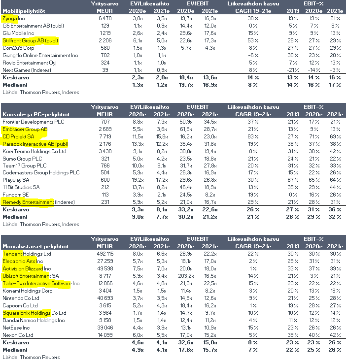 Verneri tyhjensi jo pajatson ja tuossa listassa on kyllä kaikki keskeisimmät asiat, mitä peliyhtiöissä katsoa. Pitkässä juoksussa erityisesti laatu ratkaisee ja siinä on kyllä innokkailla pelaajilla mahdollisuus saada vähintäänkin pientä kilpailuetua omien pelikokemusten kautta salkunhoitajia/analyytikoita vastaan, joilla aikaa pelaamiseen usein jää harmillisen vähän.
