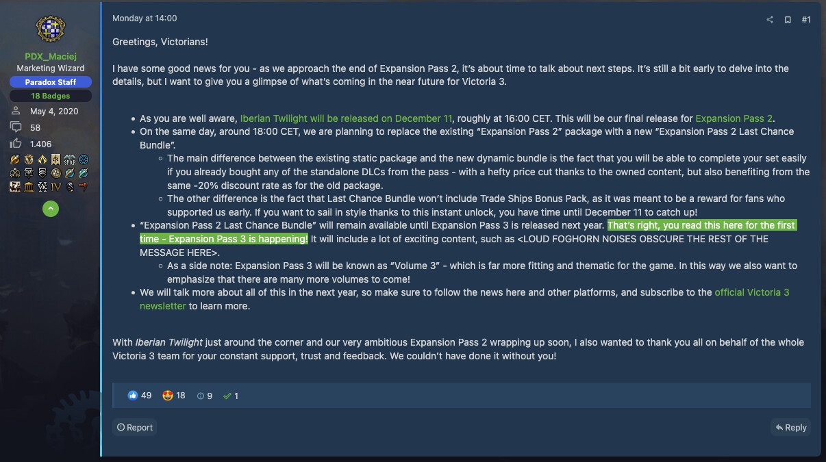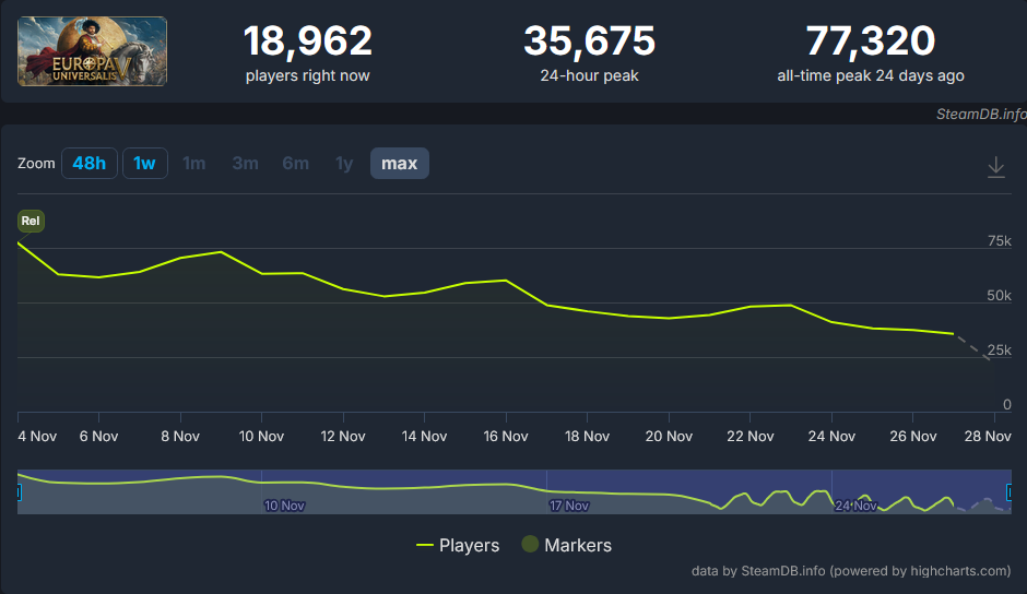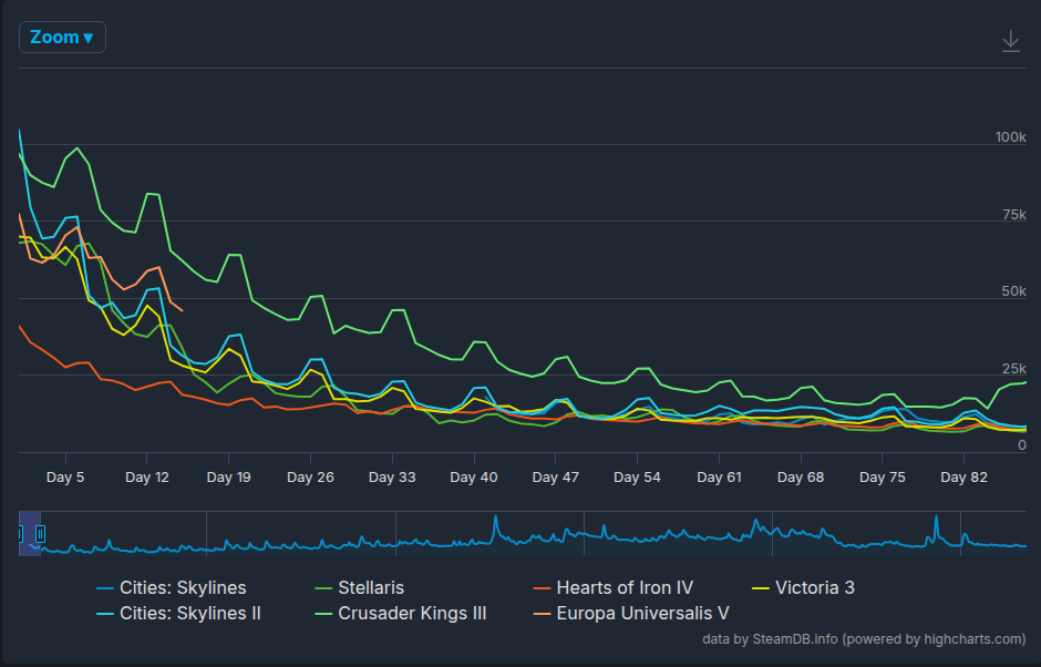 Vaikka onkin huolestuttavaa, että pelaajamäärät ovatkin timesink-kaltaisessa pelissä näin merkittävässä laskussa, on julkaisu kuitenkin ollut sen verta iso, että mitään hätää ei ole. Lisäksi Paradox on kouluttanut pelaajakuntansa, itseni mukaan lukien, odottamaan pelien ostoa myöhemmin kun peliä riittävästi korjailtua ja muutamia lisäsisältöjkä tehty. Eiköhän peli 2-3v akselilla myös omaan pelikirjastoon löydä, yleensä ajan kanssa muutaman lisäsisällön kanssa.